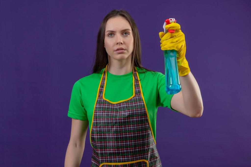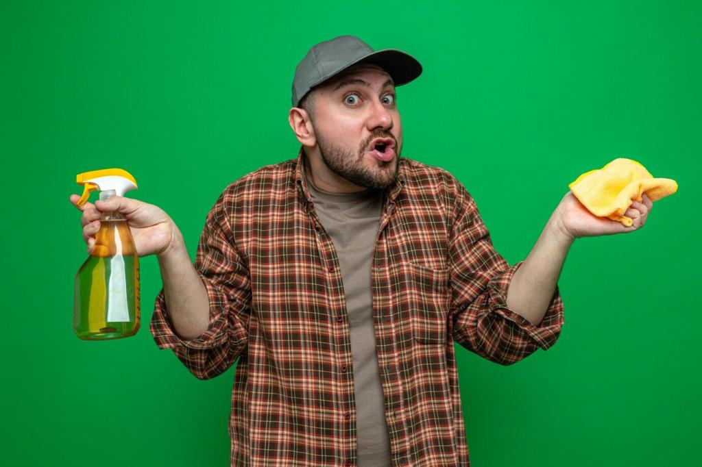 Greife zu Glasflaschen mit Feinnebel-Sprüher, weichen Baumwoll- oder Mikrofaser-Tüchern, einer Naturhaar-Bürste und kleinen Holzspateln. All das lässt sich reinigen, wiederverwenden und schont Oberflächen – gut für Leder, gut für den Planeten.